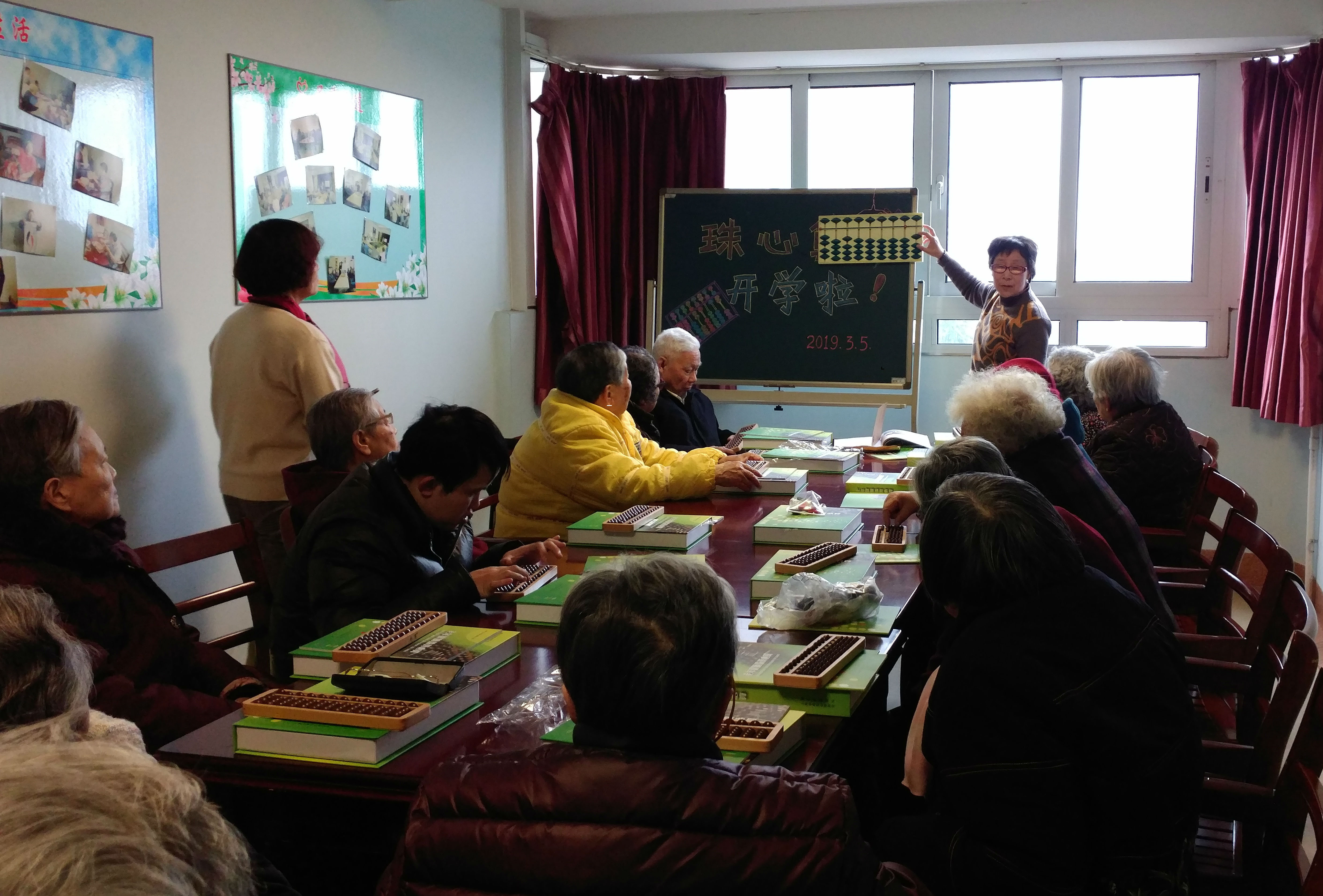 2019年3月5日下午,徐汇区社会福利院六楼教室里时不时地传来了一阵阵清脆的珠算声,一会儿传来了整齐的拍手声,一会儿又传来了欢快的大合唱,这吸引了很多室外老人和家属。原来这学期福利院新开设了一门珠心算,近20名住养老人在华泾镇社区学校珠心算志愿者老师的带领下开始了珠算学习之旅。