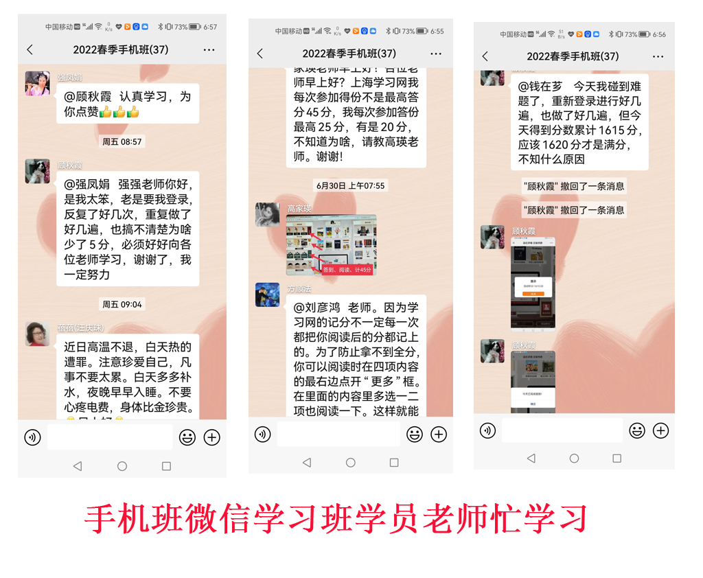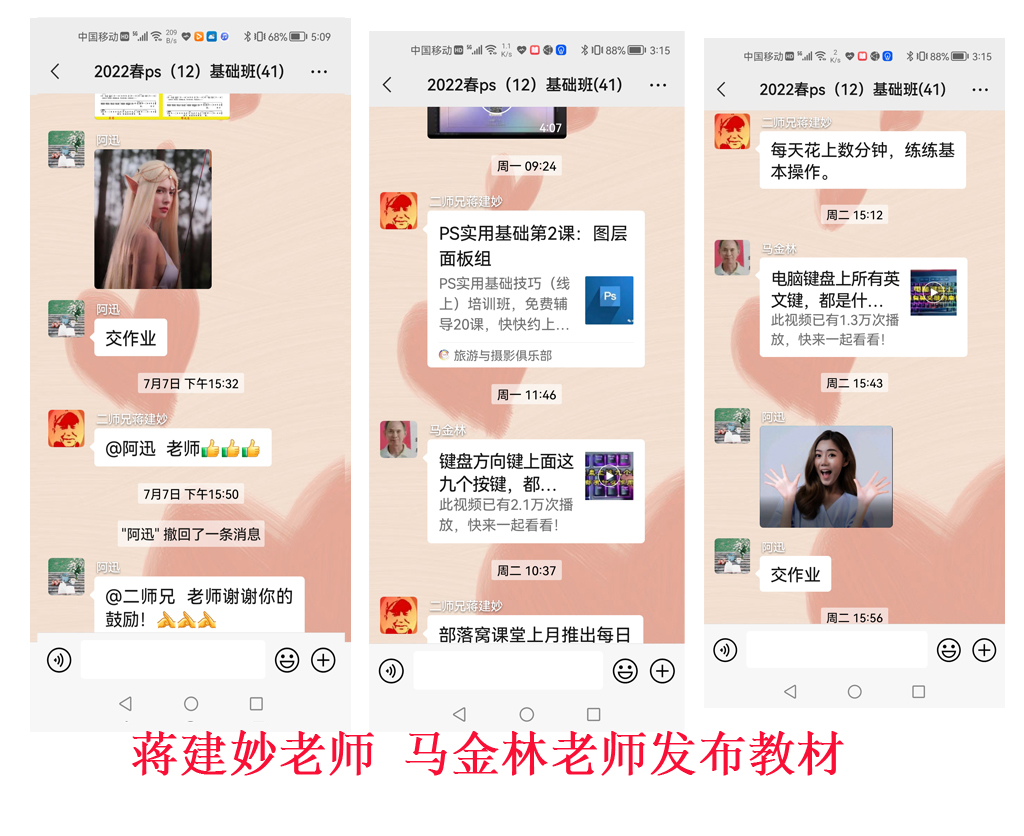 团队顺利完成了今年春季学校的布置教学计划, 虽然已经放假,但是学员们的学习热情不减,老师和班长也继续保持旺盛的奉献精神,把微信学习群,搞得热火朝天,盛况依旧,老师积极发布新课外学习资料,学员不断吸纳新的知识。PS班蒋建妙,马金林老师制作视频和电子教材及时公布,班长江海琴带领学员,认真学习,提交作业。手机班在虞慧君老师辅导品味书香活动后,暑假期间,参加活动不停步,高家瑛老师,强凤娟班长,随时随地,发现学员有困难,及时帮助学员,增强了学员参加品香书香阅读活动的信心。更显终身学习永不停步的新气象。