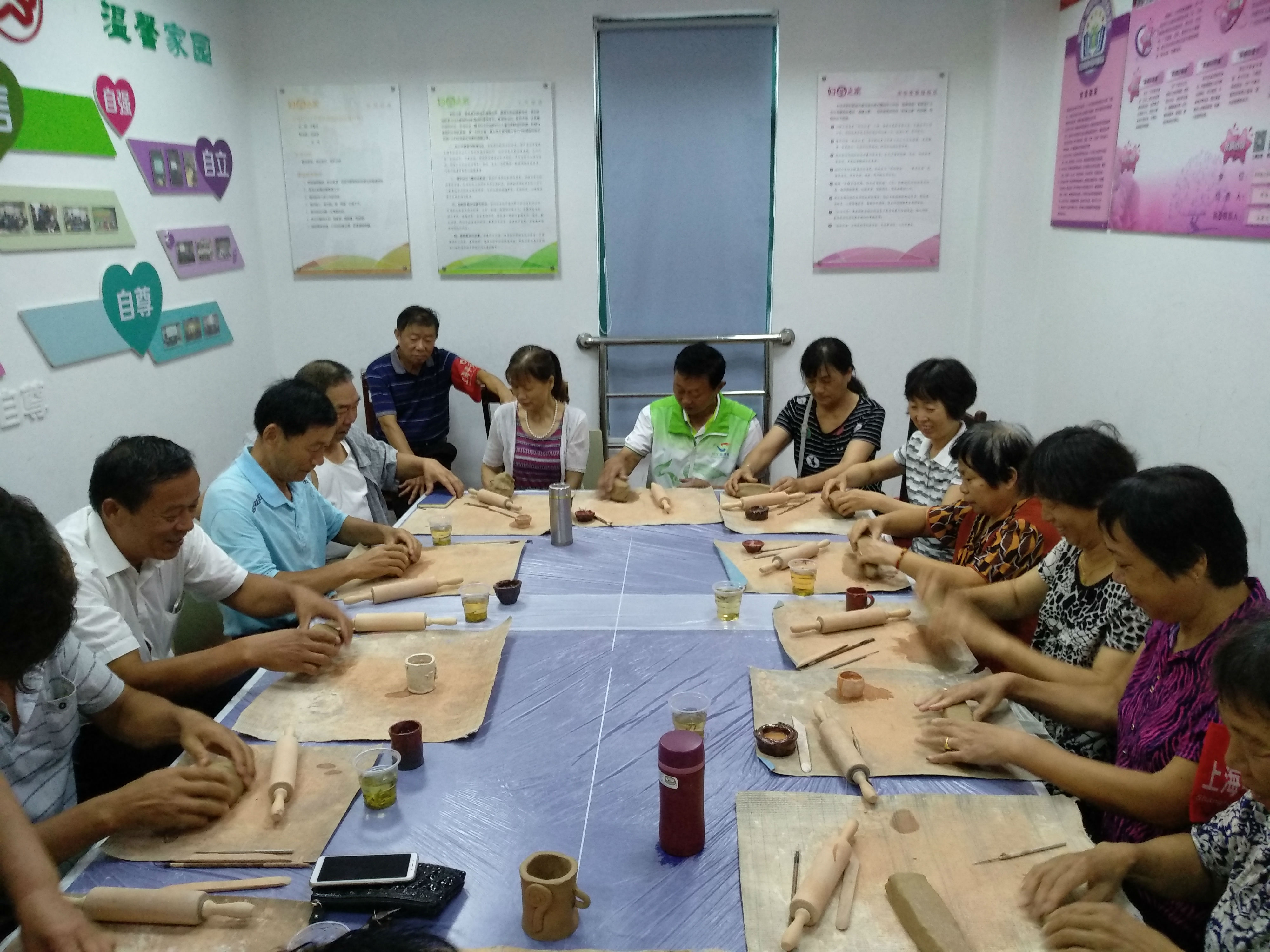活动广泛邀请社区老年居民共同参加,首先由专业老师向大家讲解如何制作陶杯,随后分发了陶泥以及一些小道具,在制作的过程中,居民们都想方设法的把陶泥捏成他们想要的形状,但却事违人愿,但专业老师的指点下,老年居民在几次尝试以后,终于捏出了自己理想中的样子。在自己动手参与瓷器的制作,最终一件件较为出色的艺术品在手中诞生。
