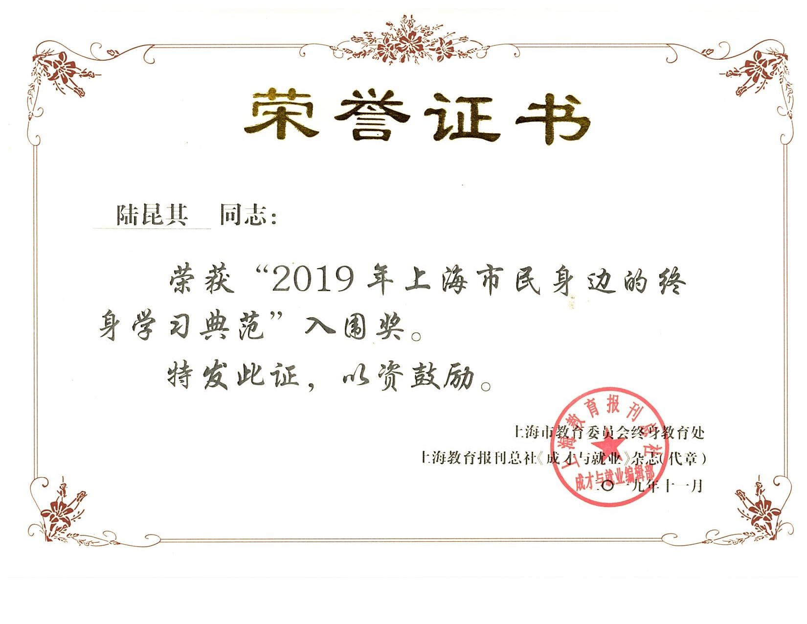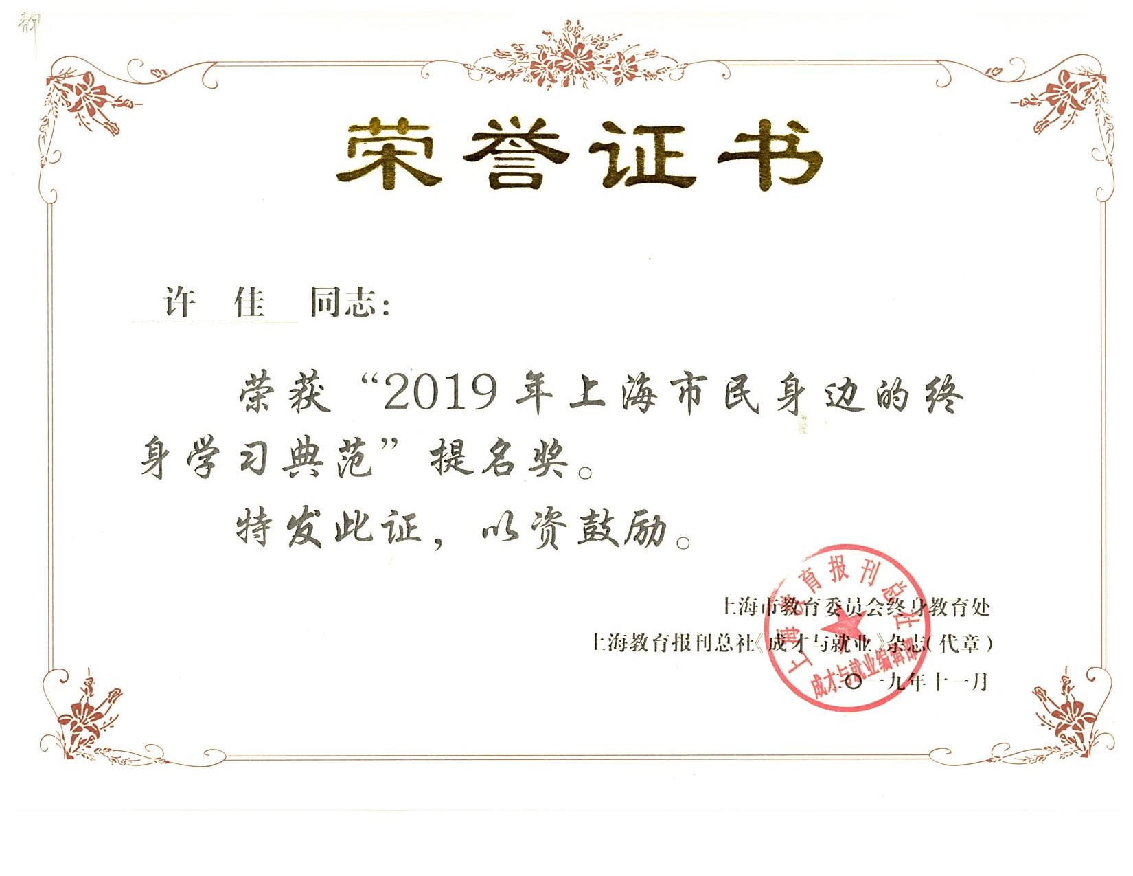 在上海市教委终身教育处领导的指导与关心下,《成才与就业》杂志于2019年开展“终身学习品牌项目推广之上海市民身边的终身学习典范”推介活动,静安区推荐的4名学习典范在推介活动中分获“上海市民身边的终身学习典范”提名奖和入围奖。静安社区学院立足区情,创立的特色品牌项目——老年生命教育,作为终身学习品牌项目入围“终身学习品牌项目推广”。