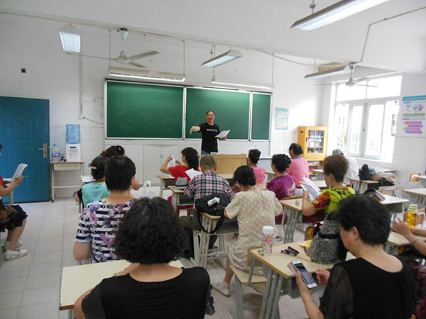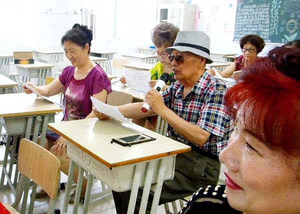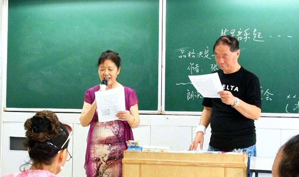 七月十七日上午是我们“诵读爱好者俱乐部”的活动日,尽管天气炎热,连续酷暑,但是大家“诵读”热情不减,住在外区,年龄最长八十三岁的金 工第一个赶到学校,俱乐部只有一位老师,因病住院请假外,其他大部分是七十岁左右的诵读爱好者,全部按时到位。