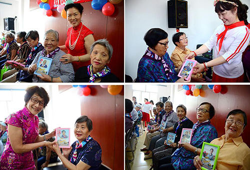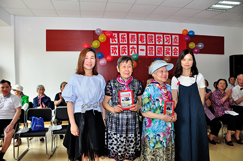 颁奖从民政科陈科长为长乐学习点的“敬业老班长”八十七岁的高永德老先生为起点;稍后由须校长的代表朱 琦主任和大场社区学校顾老师,向九十岁的优秀学员许招婵和曹美玉颁奖;刘院长,范老师和钱在芗分别向三对获得“勤奋夫妻学员”称号的老夫妻颁发奖状;还有十三位老人,分别从学习点戴着红领巾的王继玲,虞琪儿,苑雅萍,周风英,汤三媛等五位老师的手中接过彩色镜框,别具一格用ps制作的奖状,令老人们爱不择手,笑得合不拢嘴,紧紧握住老师们的手,激动不己,含着泪花,连声道谢,场景感人。获奖的老人高永德,曹美玉,仇孝礼还在拿到奖状后。兴奋地放声唱起了她们喜爱的歌。新学员残疾老人干柏年,也用颤抖的声音,唱了一首与他年龄不相称的“闪闪的红星”儿童歌曲,场面感人至深。一年多来,老班长不仅帮助老师安排好上课,还经常搀扶其他老人,深得大家的尊敬。优秀学员许招婵和曹美玉,是开展文化养老的积极参与者,九旬老人许招婵视力几乎为零,但是在征文投稿活动中,用感觉和高度放大镜前后写了五,六篇文章,尽管字体歪歪斜斜,笔划不清,但是老人的忠于学习的精神,令人敬佩,她在观看墙报“学习园地”时,是用高倍望远镜观看的。曹美玉也是文化养老的积极分子,九十岁高龄耳朵欠佳,但是记忆力不减当年,凭着记忆力多次改编老歌,嵌入歌词,为学习点提供了新的学习教材。
