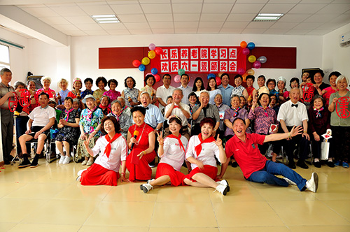 演出前经过我们老师简单化妆的老人们,个个神采奕奕,满面春风,洋溢着发自内心的喜悦,一扫九旬暮年的老态,笑展九龄童孩天真。领导简单讲话后,节目从老人90合唱队为养老院护工舞蹈伴唱“社员都是向阳花”“红梅赞”开始,这些纯朴的护工阿姨们,得到了领导的支持和老人的理解,在确保老人的安全下,学习点的周凤英老师,不怕苦和累,自掏腰包给护工买彩色扇子演出道具,组织她们成立了上海市第一个外来人员组成的”护工舞蹈队”,见缝插针,勤学苦练,经过近一年的培训,把一个个什么也不会的农妇,洋洋洒洒,翩翩起舞送上了众目睽睽的舞台。由学习点戴着红领巾的负责老师王继玲主持的欢庆会,还特地朗诵了,宝山优秀的顾村诗社团队沈仙万老师,为我们欢庆会创作的新诗“少先队队旗”,诗中写道“如今虽已白发苍苍 心头仍闪耀着火炬的光亮 让我们再一次举起队旗 夕阳回到八九点钟的模样”……。为欢庆会增加了浓浓的文化色彩,也显示了宝山区优秀学习型团队相互学习的风采。