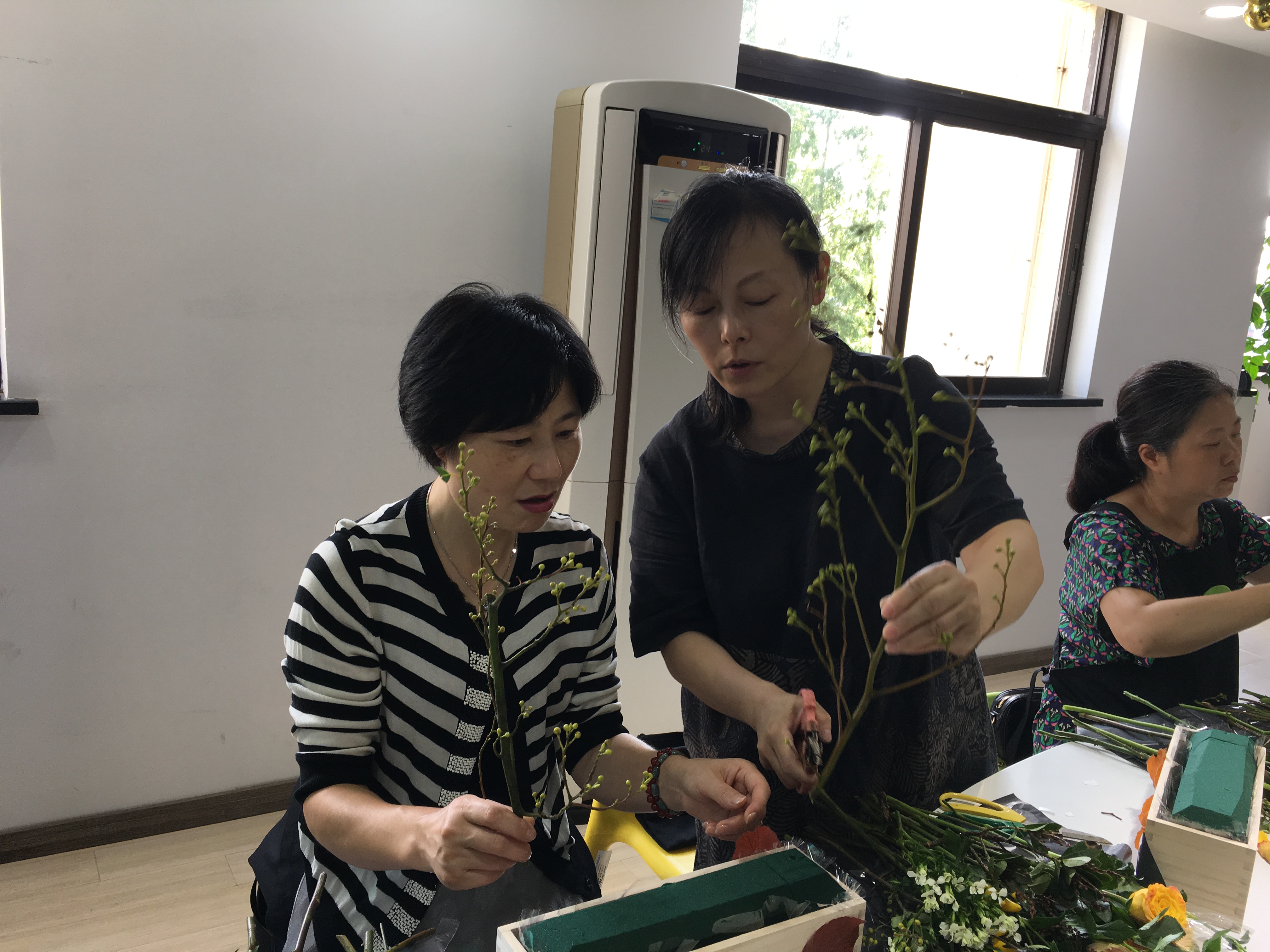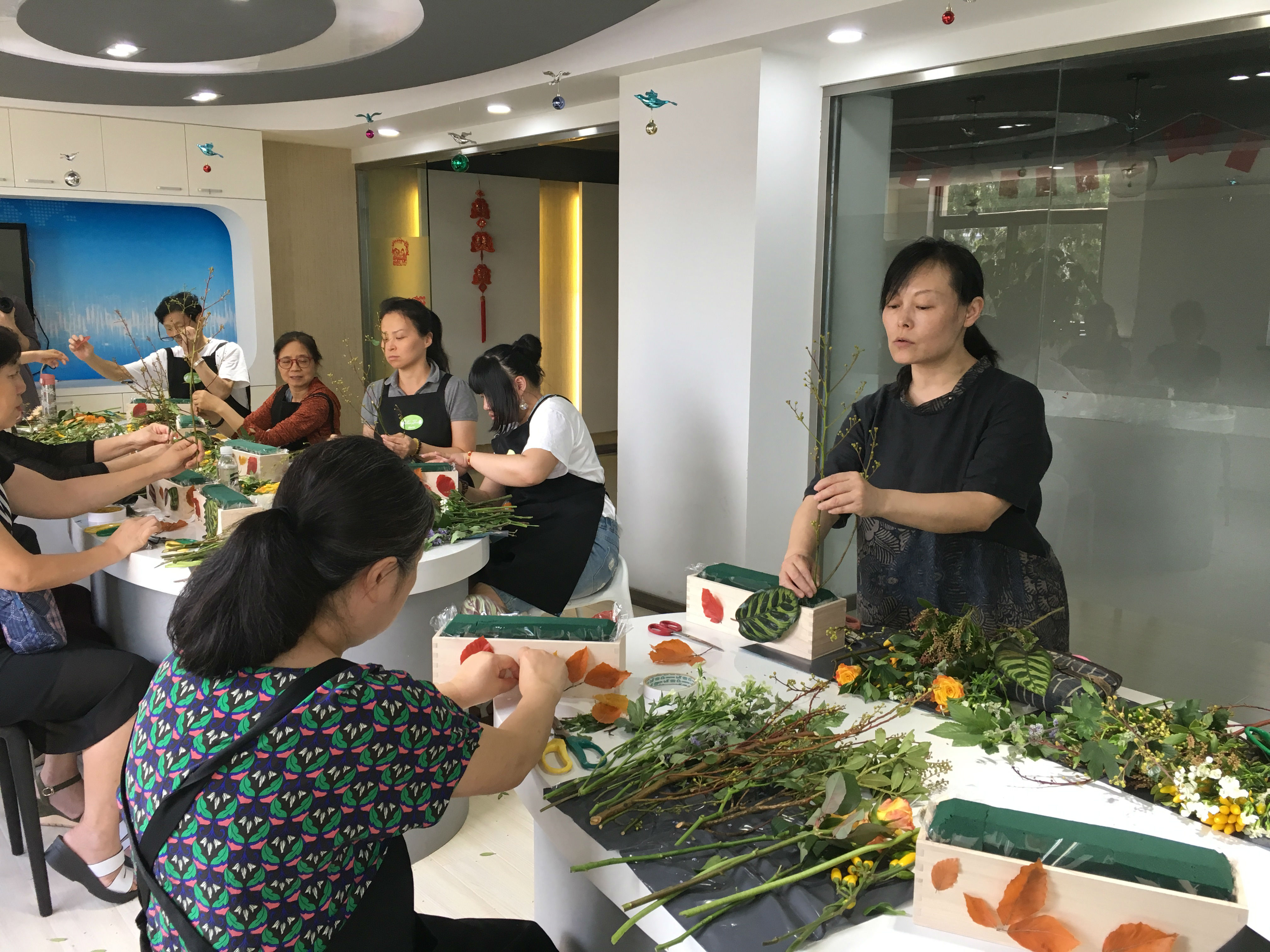 大家在老师的指导下,边听边学边操作,个个兴趣满满,创造出形态各异的插花艺术品。