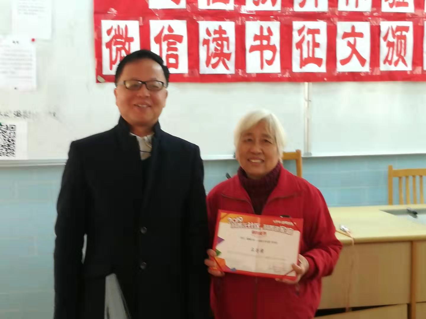 领导为“微信读书”征文作品的十五位作者,黄玉梅,王继玲,杨君朴等三人颁发了一等奖,还为管雅琴,张晋慧等十二位作者分别颁发了二等,三等奖。