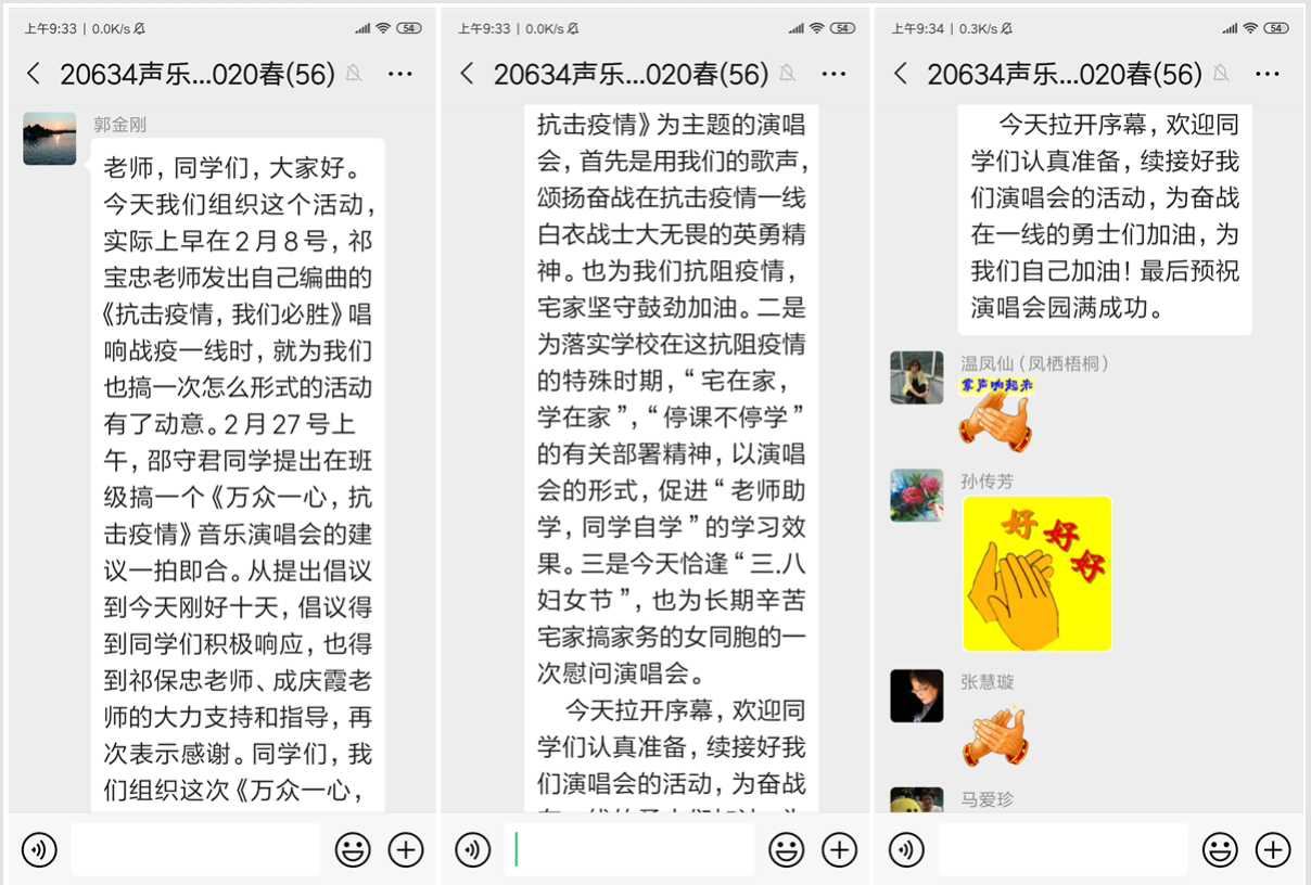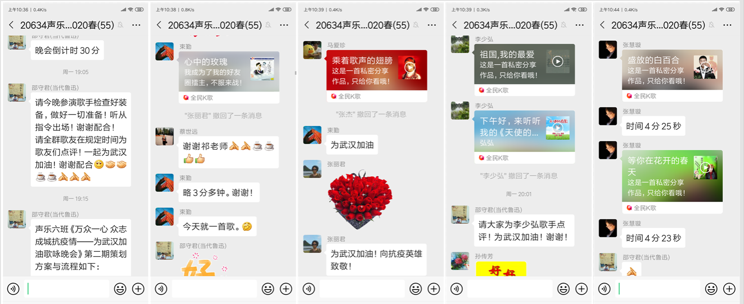 2月26日,声乐六班邵守君学员在班级微信群发出倡议:用我们的歌声向白衣战士致敬,为英雄武汉加油!学员们积极响应,热情参与,迅速成立了以老师和学员组成的“歌咏组委会”,确定歌曲曲目和排练时间,大家都有一个共同的心愿,我们虽然宅在家中,依然要为防疫抗疫贡献力量。
