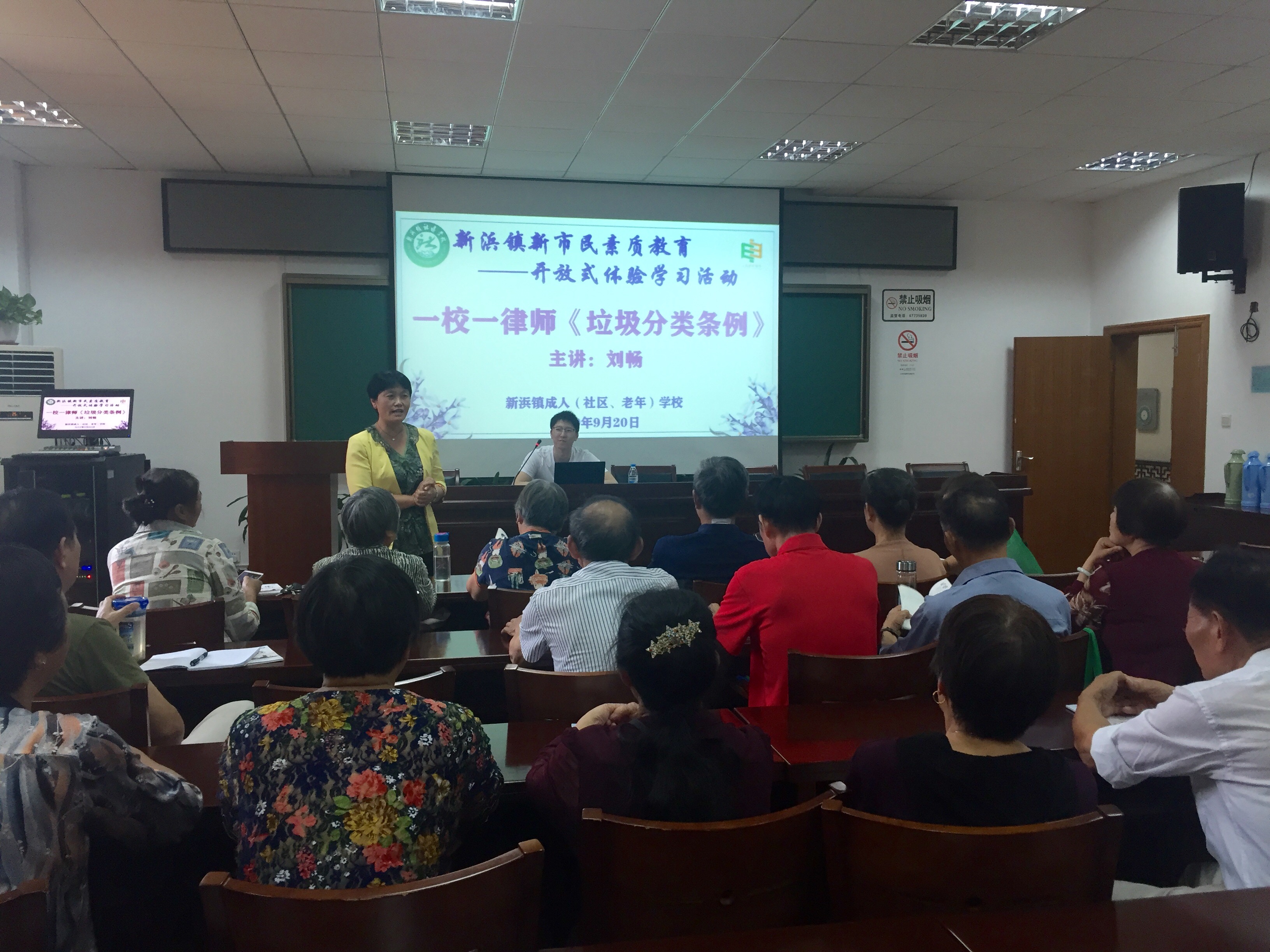 9月20日下午一点半,松江区新浜镇成人(社区、老年)学校开展了紫色新浜“开放体验日”活动。本次活动主要分为一校一律师《垃圾分类条例》讲座和生活情趣体验“牛轧糖制作”两个环节,近三十位学员参与其中。作为本学期的第一次“开放体验日”活动,校长范林峰和副校长王一峰也来到了活动现场。两位校长都真切地希望学员们能在这里老有所学,老有所乐。