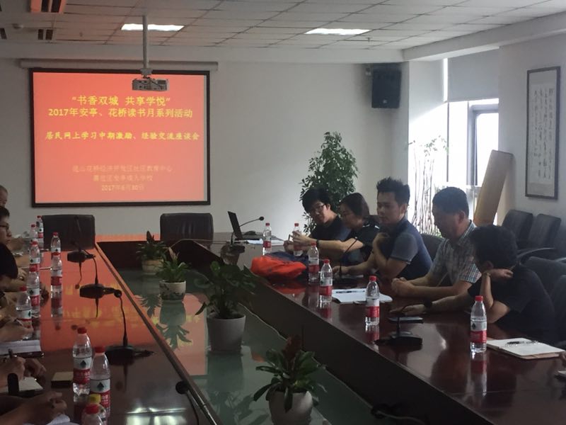6月30日下午,“书香双城·共享学悦”2017年安亭·花桥读书月系列活动之市民网上学习中期激励、经验交流座谈会在昆山花桥经济开发区社区教育中心顺利举行。嘉定区安亭镇成人学校副校长张加良、花桥经济开发区社区教育中心校长袁宝双等领导,以及安亭·花桥社区学习点管理干部与市民代表30余人参加了本次会议。