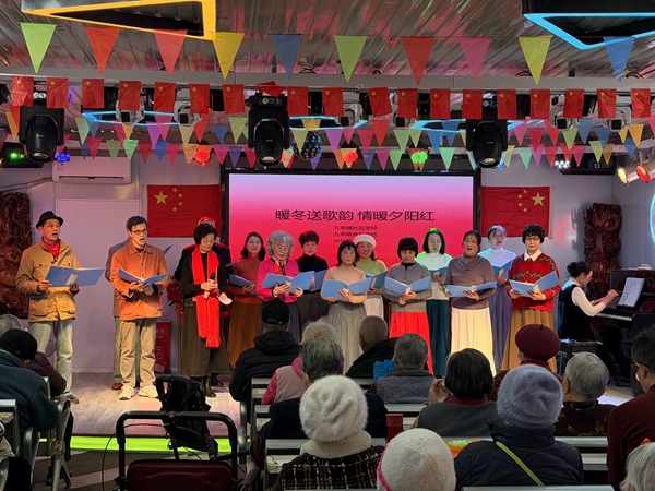 文艺演出在歌唱班学员激昂的合唱《松花江上》中拉开序幕,熟悉的旋律瞬间勾起在场老人的共同记忆,不少人跟着轻声哼唱。随后,独唱《美丽的草原我的家》以悠远的意境赢得满堂喝彩,演唱者饱含深情的演绎将草原风光娓娓道来。红歌联唱环节串联起多首经典曲目,铿锵有力的歌声传递出代代相传的红色情怀,现场氛围逐渐升温。女生小组唱带来的《卡布里岛》《蓝莓之恋》兼具异域韵味与青春活力,甜美的歌声让现场老人面露笑意;太极表演则尽显刚柔并济的养生智慧,表演者舒展的动作引来阵阵赞叹。压轴登场的女生小组唱《共筑中国梦》《夕阳红》与大合唱《情歌的故乡》将演出推向高潮,学员们还热情邀请在场老人一同学唱,台上台下歌声交融,笑声与掌声在大厅内久久回荡。“这些歌都唱到我们心坎里了,跟着学唱的时候感觉自己也年轻了好几岁!”今年一位阿姨笑着说道。